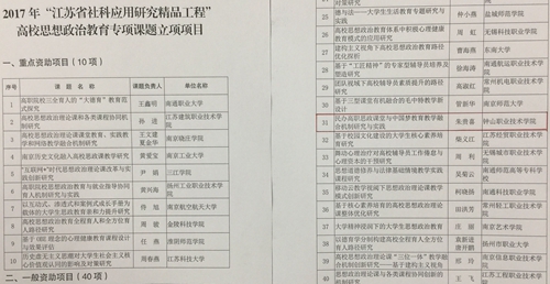近日,江苏省哲学社会科学界联合会公布了《2017 年“江苏省社科应用研究精品工程”高校思想政治教育专项课题》立项结果。经专家组评审和江苏省社科联党组审定,在600多个申请项目中,共评定重点资助项目10项,一般资助项目40项,立项不资助项目40项。我院教务处处长朱贵喜副研究员申报的《民办高职思政课堂与中国梦教育教学融合机制研究与实践》获批一般资助项目立项。(文/摄影 龚剑锋)