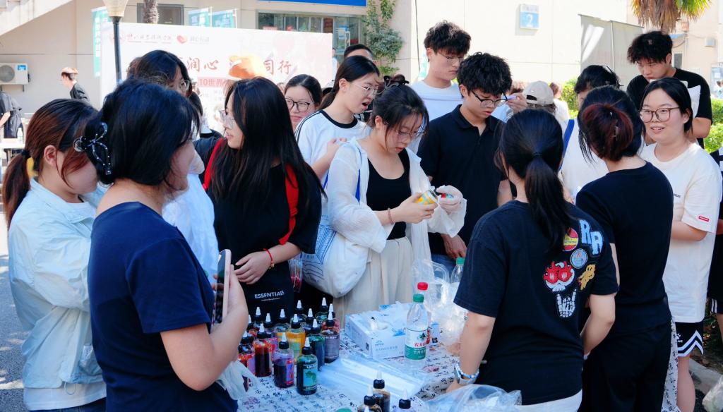 活动现场精心设置了多元疗愈体验与心理科普板块,学生可根据个人兴趣自由参与。在涂鸦区,同学们亲手勾勒绽放的笑脸;扎染区里,缤纷颜料在布料间晕染出心灵的色彩;曼陀罗绘制区中,笔触随情绪在纸间流淌,让色彩成为心情的注脚;盲盒领养区里,大家用爱心“认领”象征陪伴的动物玩偶;灯谜互动区则掀起思维交锋的热潮…… 更有不少同学与心理咨询师面对面敞开心扉,通过“心理格盘”“心灵OH卡”等专业工具,在轻松氛围中释放情绪、疏解困惑。现场处处洋溢着心灵疗愈的温暖气息,让每个参与者都在沉浸式体验中收获内心的平和与力量。