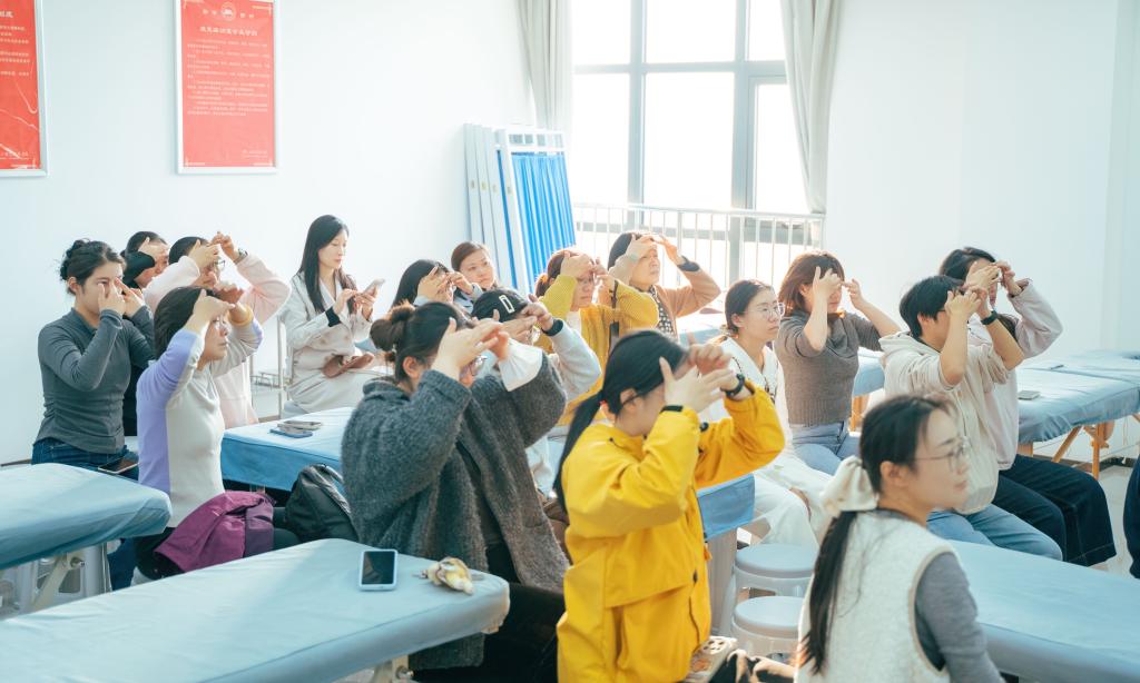 健康管理与康复学院张一鸣老师以“秋收・养阴・润美人”为题,用通俗语言结合典型案例,从衣、食、住、行多方面普及中医养生知识,讲解秋冬女性养生原则、饮食调理、起居要点及常见健康问题预防,同时提醒并纠正影响健康的不良生活习惯,让老师们深切感受中医的博大精深与独特价值。苏杨老师围绕“面部刮痧与美容”展开分享,介绍常见职业病调理方法、艾灸原理功效、刮痧基础知识,演示针对疲劳、感冒、肩颈酸痛的刮痧手法与部位,以及颈椎病、肩周炎、腰背不适等职业病的艾灸穴位与操作流程。
