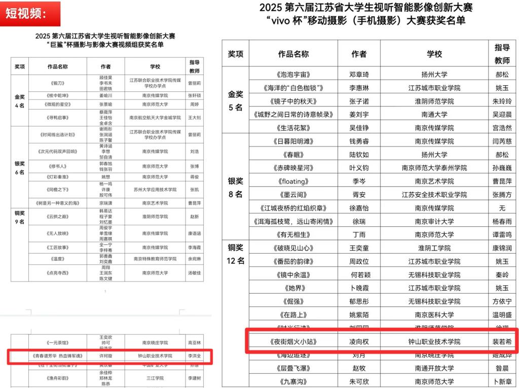 我校数据管理与智能工程学院在本届赛事中表现优异,共获四项荣誉。具体包括:许珂璇同学的短视频作品《青春谱芳华 热血铸军魂》获短视频赛道铜奖,该作品由李洪全老师指导;凌向权同学的作品《夜街烟火小站》获移动摄影赛道铜奖;赵子翔同学的作品《熵与心声》获人工智能影像赛道优秀奖;学院裴若希老师获评“优秀指导教师”。