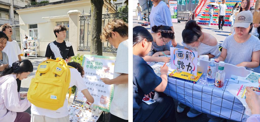 活动现场精心设置了多元疗愈体验与心理科普板块,学生可根据个人兴趣自由参与。在涂鸦区,同学们亲手勾勒绽放的笑脸;扎染区里,缤纷颜料在布料间晕染出心灵的色彩;曼陀罗绘制区中,笔触随情绪在纸间流淌,让色彩成为心情的注脚;盲盒领养区里,大家用爱心“认领”象征陪伴的动物玩偶;灯谜互动区则掀起思维交锋的热潮…… 更有不少同学与心理咨询师面对面敞开心扉,通过“心理格盘”“心灵OH卡”等专业工具,在轻松氛围中释放情绪、疏解困惑。现场处处洋溢着心灵疗愈的温暖气息,让每个参与者都在沉浸式体验中收获内心的平和与力量。