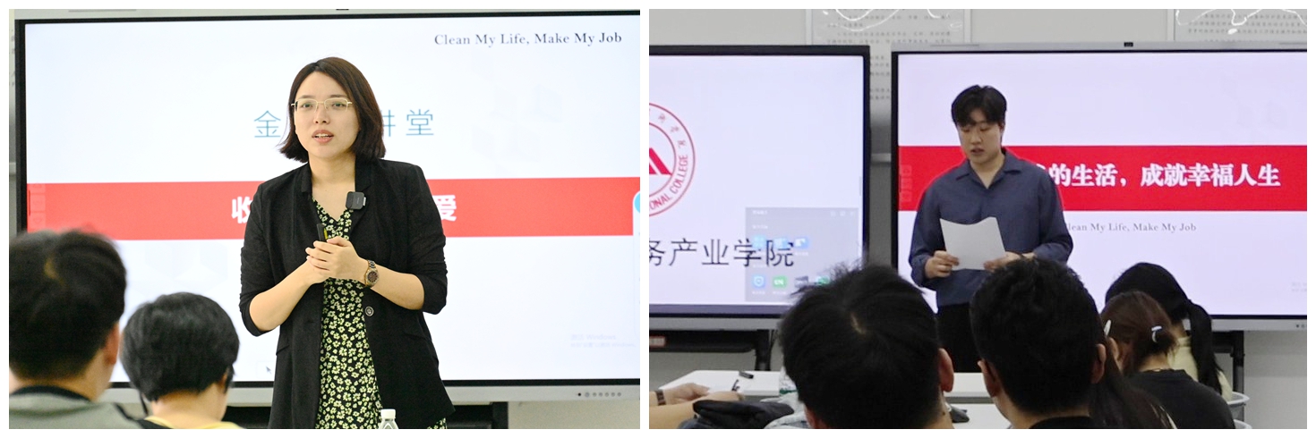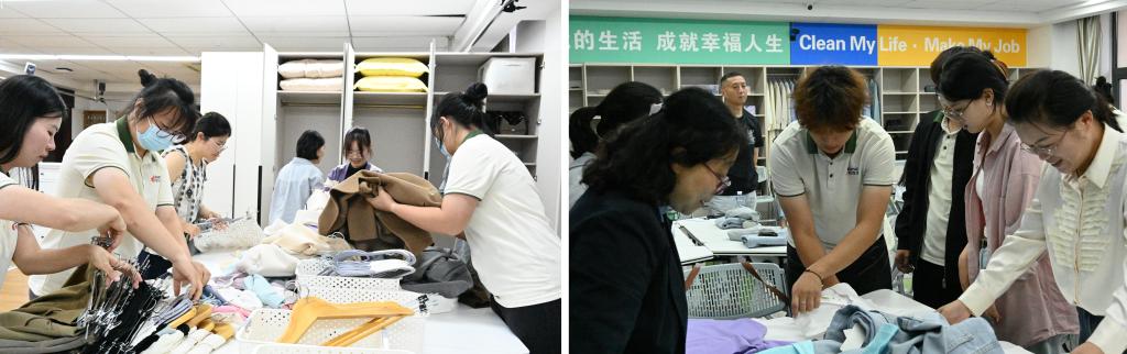 此次活动由学院副教授于雨倩主讲,她系统阐述整理、收纳与清洁的概念区别,重点解读从“以物为本”到“以人为本”的思维转变,并通过真实案例解析囤积行为的隐患,提出实用解决方法。学生演示了入户服务流程,生动展示整理收纳的专业标准。参与者还分组练习衣物折叠与收纳工具使用,学习“卷放”“立放”等高效技巧。整理不仅是学会折叠,更要理解“能够坚持、有效整理”的底层逻辑。随后,都民整理总经理金湖岩在总结发言中,回顾了公司的创业历程与行业实践探索,同时介绍了现代家政服务产业学院的建设进程以及人才培养相关工作。