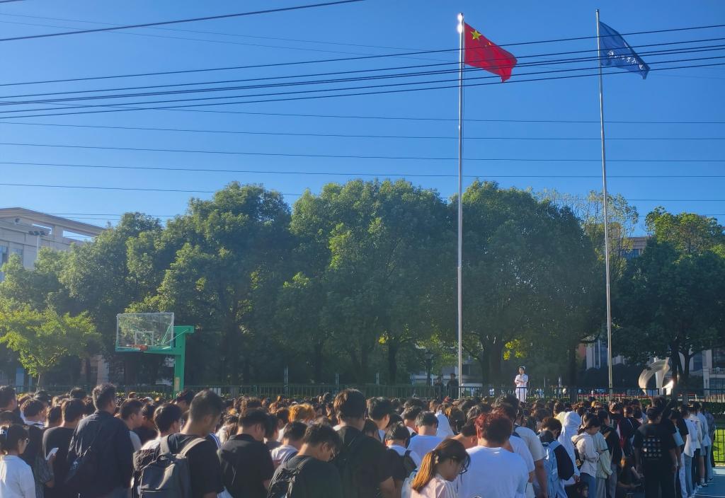 迎着初秋的朝阳,学校国旗护卫队队员身着礼宾服装、手持礼宾枪械,迈着刚健有力的步伐,将国旗护送至升旗台。伴随着气势雄壮的《义勇军进行曲》,五星红旗缓缓升起。